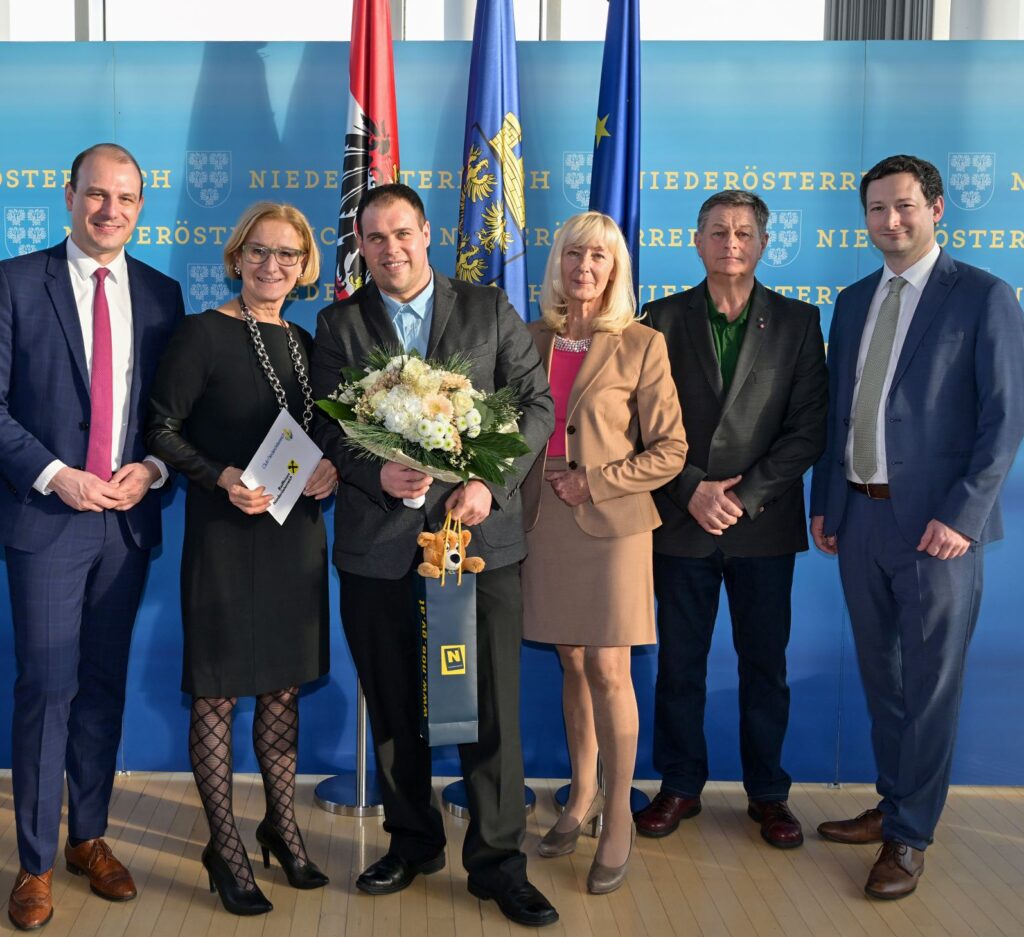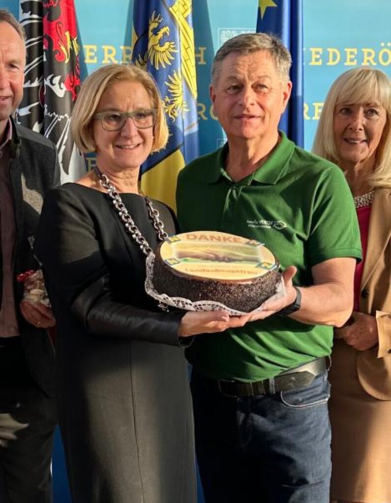 Anlässlich einer wunderschönen Ehrungsfeier im Mileniumsaal der NÖ.Landesregierung erhielten 2 Familien aus unserem Bezirk von Frau Landeshauptfrau ein Kuvert und für die Mütter Blumen sowie für die Kinder kleine Geschenke. Als Dankeschön erhielt sie vom Benefiz Verein Waldviertel eine wunderschöne Torte aus der Bäckerei Huber Arbesbach. Herr Franz Stiedl mit seinem Team hat diese Torte eigens für Sie angefertigt. Am Bild: Toni Pfeffer v Club NÖ, Landeshauptfrau Johanna Mikl-Leitner, Willi Stöcklhuber Obmann u Theres Frihwald-Hofbauer vom Club NÖ.