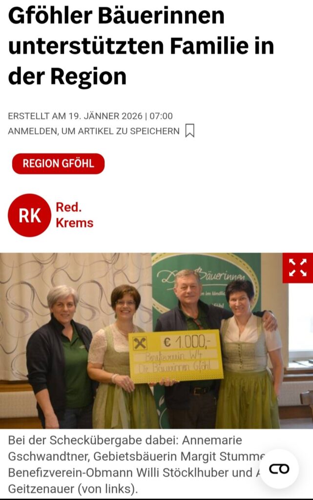 Beim Tag der Bäuerinnen aus dem ehemaligen Kammerbezirk Gföhl im GH Schindler in 3522 Brunn/W erfolgte die offizielle Scheckübergabe an den Benefizverein W4.Geld bekamen wir im Herbst 2025 und die 1.000 Euro wurden gemeinsam an eine Familie im Bez.Zwettl übergeben nach einem Schickschalschlag.Das war der Wunsch der Spender,das Geld gemeinsam zu übergeben.Wir danken von Herzen an den gesamten Vorstand angeführt von Fr.Gebietsbäuerin Margit Stummer, Andrea Geitzenauer und Anita Fürlinger. Das Geld stammt von ihren traditionellen“Guglhupf-Schnapsen“