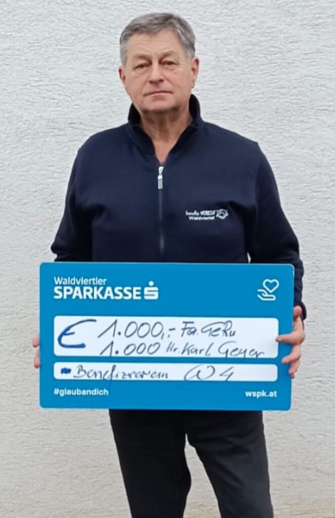 Das Geld stammt von folgenden Sponsoren! Fa.GeRu aus Martinsberg und Hr.Karl Geyer 2.Teil nach seiner wunderbaren 80iger Feier. Es war sein Wunsch,das Geld, welches er bei seiner wirklich rührenden 80iger Feier gesammelt hat für uns.Dort wurde ich gebeten,2 Projekte vorzustellen im Beisein von meiner Gattin Annemarie Gschwandtner. Und heute haben wir es aufgeteilt.